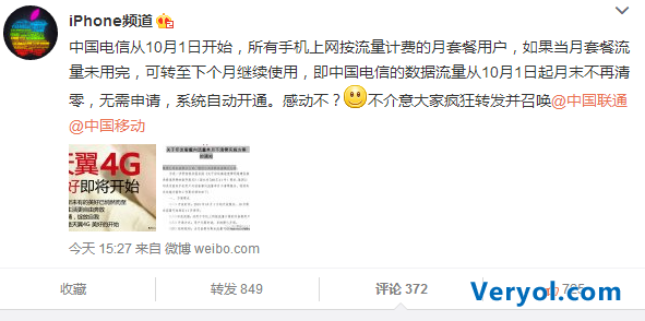 在國家政策的多番敲擊下,中國電信有所響應,今天網上出現了一個鼓舞人心的消息,微博@iPhone頻道表示:“中國電信從10月1日開始,所有手機上網按流量計費的月套餐用戶,如果當月套餐流量未用完,可轉至下個月繼續使用,即中國電信的數據流量從10月1日起月末不再清零,無需申請,系統自動開通。”并附上兩張圖,其中一張貌似就是中國電信內部的實施方案通知。此消息一發,網友們立馬奔走相告,一時間就登頂熱門微博。可見大家的心情有多激動了,有不少網友表示:已做好投入電信懷抱的準備!